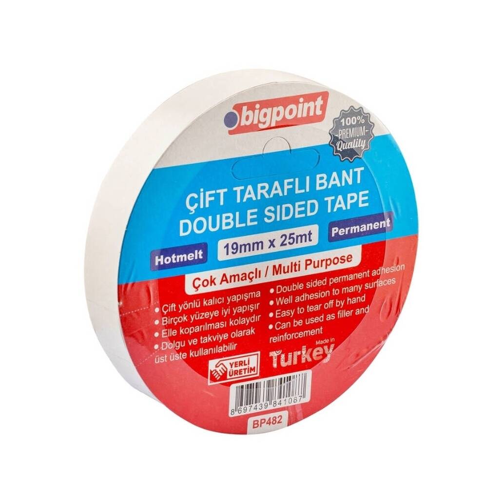 Bigpoint Çift Taraflı Hotmelt Bant, 19 mm x 25 m, Tüm Yüzeyler İçin; güçlü yapışma kabiliyeti, çok yönlü kullanım avantajı ve pratik uygulamasıyla günlük işlerden profesyonel projelere kadar her alanda güvenle tercih edilebilecek bir üründür. Hem dekoratif hem de işlevsel çözümler sunarak zamandan tasarruf etmenizi sağlar.