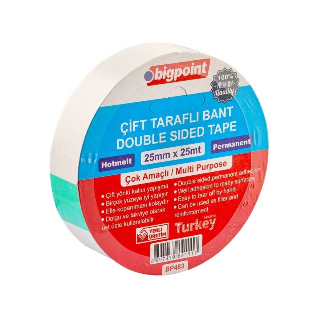 Bigpoint Çift Taraflı Hotmelt Bant, 25 mm x 25 m, Tüm Yüzeyler İçin; hem profesyonel işlerde hem de günlük yaşamda güvenilir çözümler sunar. Güçlü yapışma kabiliyeti, uzun ömürlü performansı ve kolay uygulanabilirliği ile belgelerden dekoratif ürünlere kadar pek çok farklı objeyi güvenle sabitlemek için idealdir.