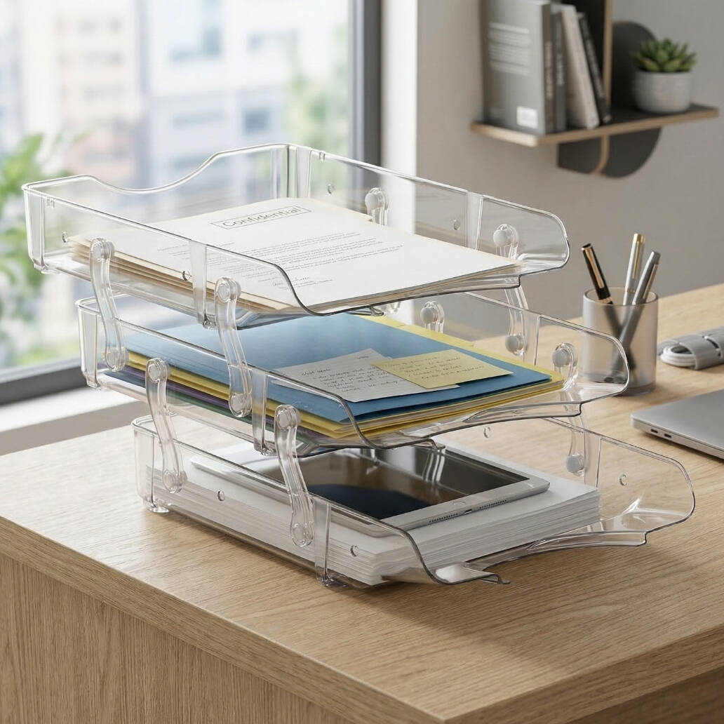 Dayanıklı plastik malzemeden üretilmiş olan evrak rafı, günlük ofis kullanımına uygun sağlam bir yapıya sahiptir. Hem bireysel çalışma alanlarında hem de yoğun evrak trafiği olan ofislerde düzen ve pratiklik sağlar.