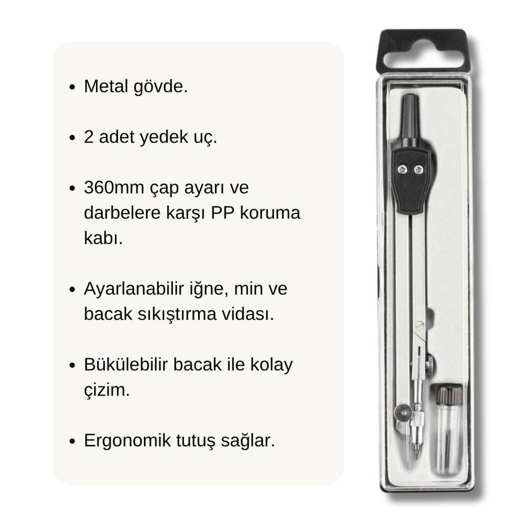 Bigpoint Metal Pergel Seti, dayanıklı ve şık metal tasarımı ile öne çıkar. Ayarlanabilir tek ayaklı yapısı sayesinde farklı çaplarda daireler çizebilir ve hassas çizimler yapabilirsiniz. Set içerisindeki 2 yedek uç, uzun ömürlü kullanım sağlar. Pergelin ergonomik yapısı, çizimlerde konfor sunar ve kolayca ayarlanabilir. Bu set, hem öğrenciler hem de profesyonel teknik çizim ihtiyaçları için mükemmel bir seçenektir.