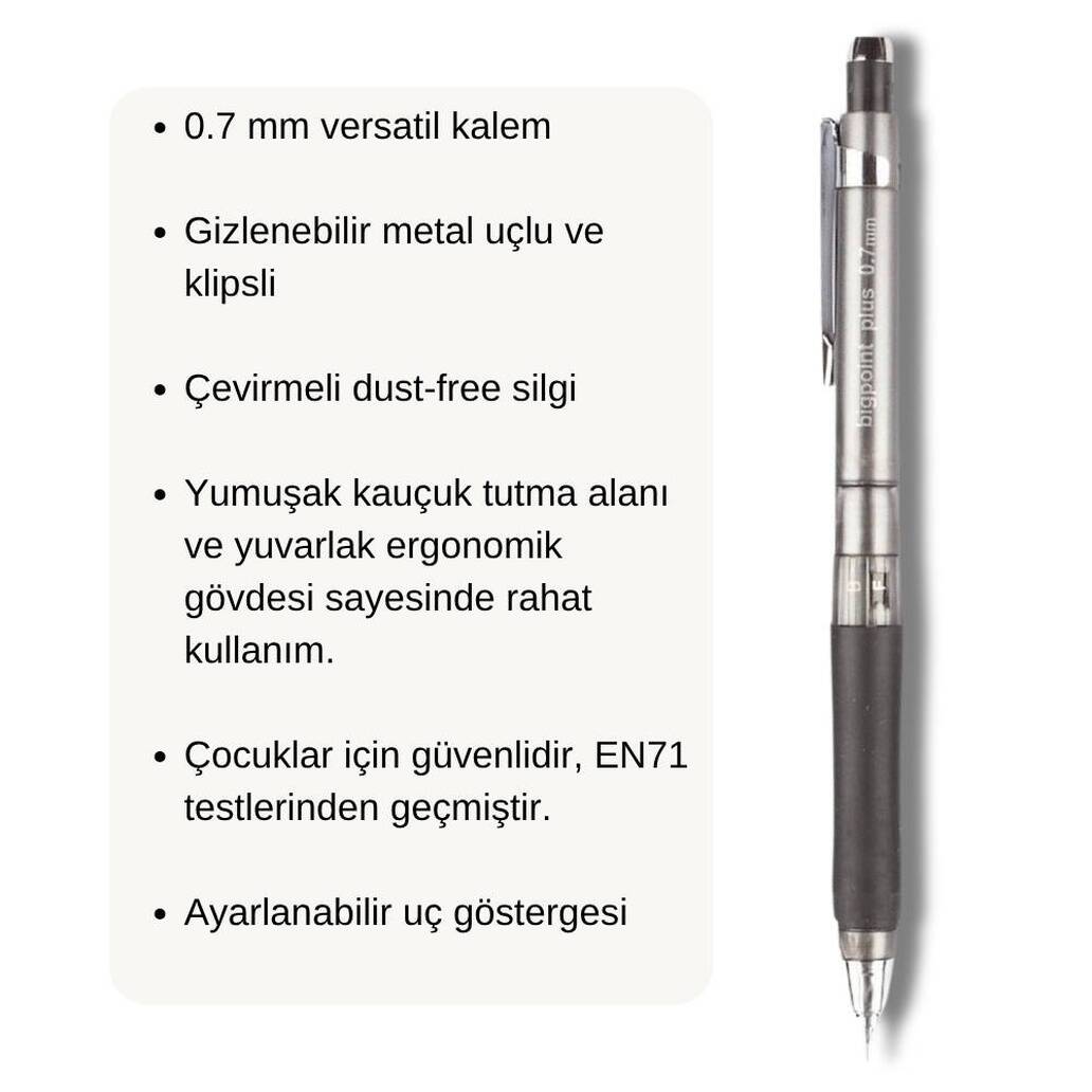 Dayanıklı Metal Uç: Gizlenebilir uç özelliğiyle kalemi taşırken uç kırılmasını önler, ömrünü uzatır.