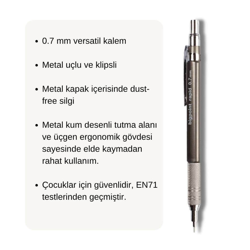 Bigpoint Rapid Versatil Kalem, dayanıklı metal uç ve kaymaz kumlu gövde yapısıyla yazı ve çizim işlerinizde üstün bir konfor sağlar. Modern gri tasarımıyla estetik bir görünüm sunan bu kalem, hem profesyoneller hem de öğrenciler için mükemmel bir tercihtir.