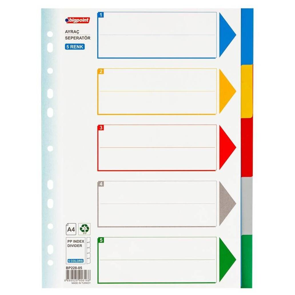 Bigpoint Seperatör, dosya ve klasörlerinizi düzenli tutmanıza yardımcı olan pratik bir çözüm sunar. 5 renkli ayraçları sayesinde belgelerinizi kolayca sınıflandırabilir, hızlı erişim sağlayabilir ve çalışma ortamınızı daha verimli hale getirebilirsiniz. Dayanıklı malzemesi, uzun süreli kullanım sağlar ve dosyalarınızın düzenli kalmasına yardımcı olur.