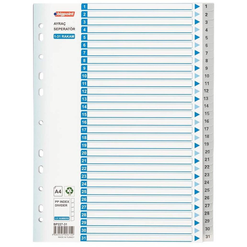 Bigpoint Rakamlı Seperatör Seti, belgelerinizi düzenli tutmanın ve hızlı erişim sağlamanın en kolay yoludur. 1'den 31'e kadar numaralı ayraçları sayesinde belgelerinizi tarih sırasına göre düzenleyebilir, klasörlerinizi kolayca yönetebilirsiniz. İş akışınızı hızlandıran bu pratik düzenleyici ayraçlar, uzun süreli ve dayanıklı bir kullanım sunar.