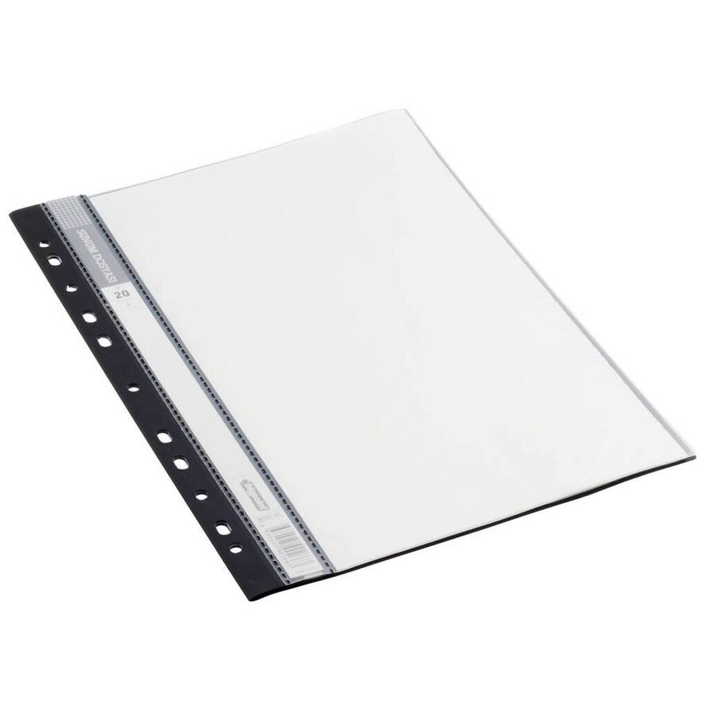 Belgelerinizi düzenli, güvenli ve şık bir şekilde saklamanızı sağlayan kaliteli bir sunum dosyasıdır. 20 şeffaf yaprağı sayesinde her iki tarafa da belge yerleştirilebilir, böylece toplamda 40 sayfa A4 kağıdı depolayabilirsiniz. Delikli tasarımı, dosyanızı kolayca klasörlerinize eklemenizi sağlar. Siyah rengi ile profesyonel ve zarif bir görünüm sunarak hem iş hem de okul için ideal bir sunum çözümü sunar.
