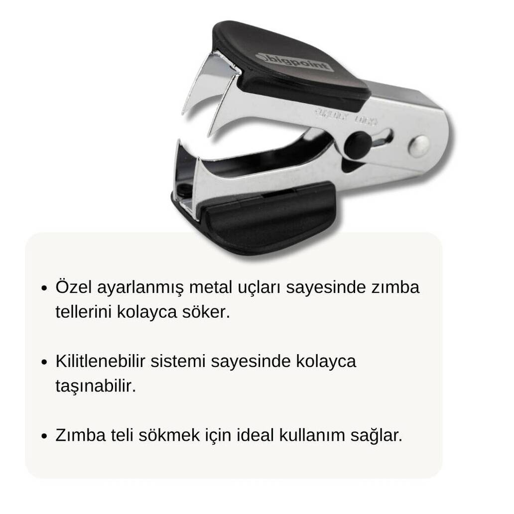 Bigpoint Zımba Sökücü, kitlenebilir koruma ve ergonomik tasarımı ile güvenli ve konforlu bir kullanım sunar. Dayanıklı yapısı ve kolay taşınabilir kompakt boyutuyla işlerinizi hızlandırır ve çalışma alanınızı düzenli tutar.