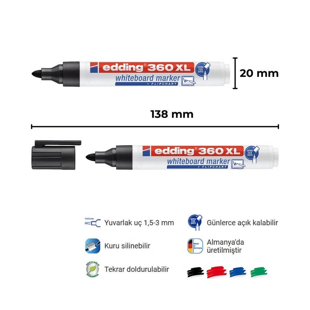 Edding E-360 XL, düşük kokulu, özel formüle edilmiş su bazlı mürekkep ile geliştirilmiştir. Beyaz tahtalarda yüksek kontrastlı yazım sunar. Siyah renk, hem uzaktan net görülebilir hem de profesyonel sunumlarda güçlü bir etki bırakır. 1.5-3 mm kalınlığındaki uç, kullanıcıya esneklik sağlar; ince detaylar ve kalın yazılar aynı kalemle yazılabilir. Cap-Off teknolojisi, yoğun kullanımlarda bile kalemin güvenilirliğini artırır.