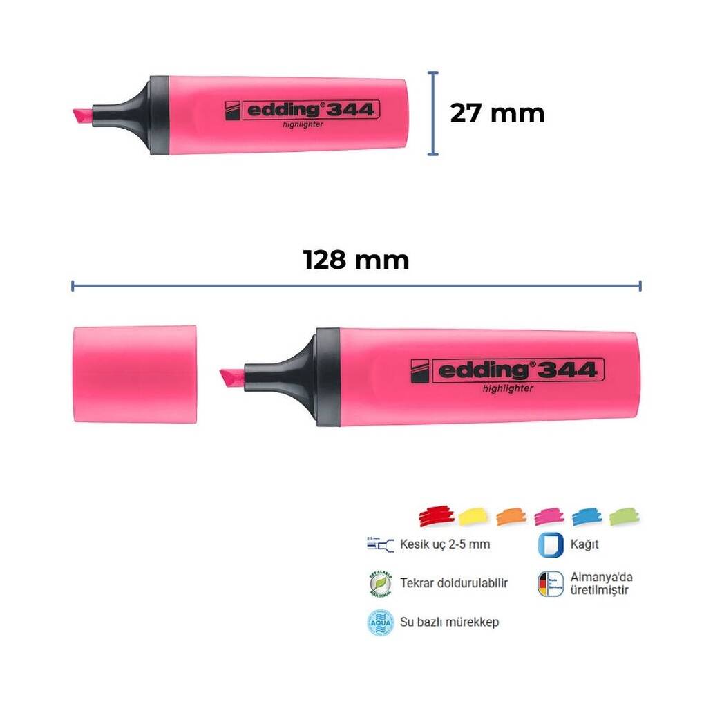 Edding Fosforlu Kalem E-344 Pembe, yüksek kaliteli su bazlı mürekkep ile üretilmiştir. Kesik uç yapısı, kullanım sırasında esneklik sunarak 2 mm ince çizgilerden 5 mm geniş vurgulara kadar farklı işaretleme seçenekleri sağlar. Mürekkep hızlı kurur, göz yormaz ve kağıtta akma yapmaz.
