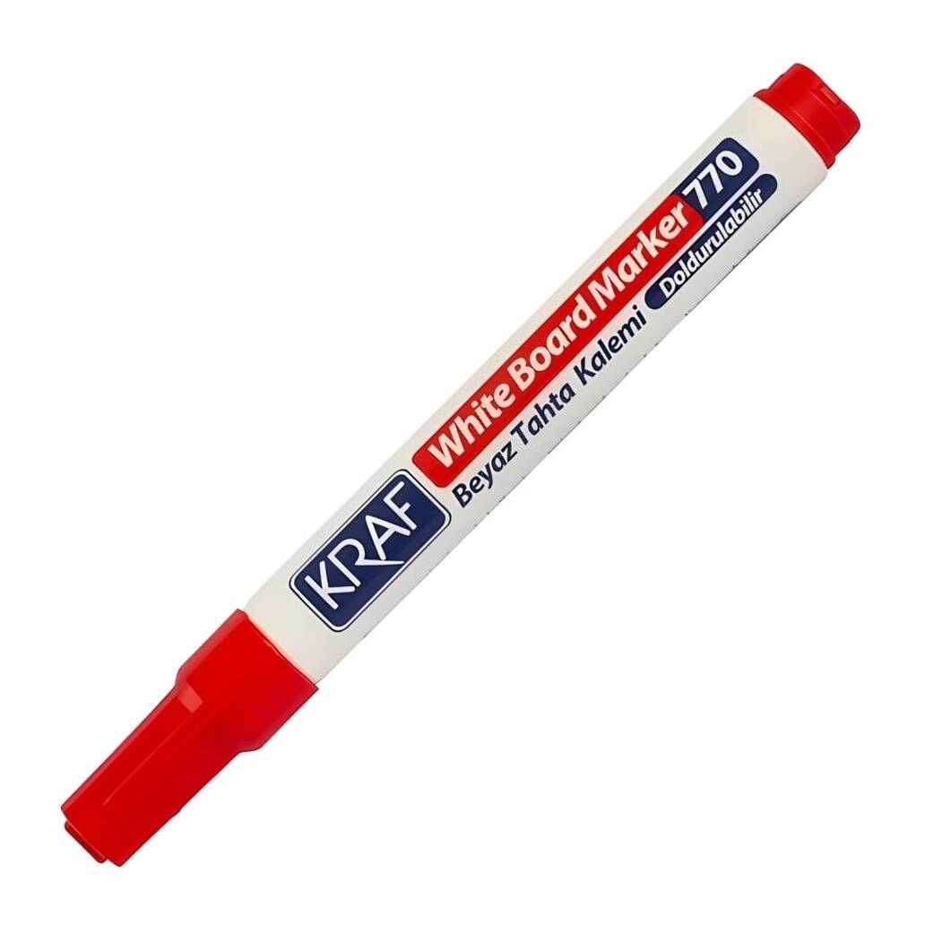 Kraf 770 Beyaz Tahta Kalemi, Kırmızı, Doldurulabilir, Uzun Ömürlü, eğitim, ofis ve toplantı ortamlarında net, canlı ve uzun süre kalıcı yazım deneyimi sunar. Canlı kırmızı rengi sayesinde yazılarınız kolayca fark edilir, özellikle önemli noktaların vurgulanması için idealdir. Doldurulabilir mürekkep özelliği ile defalarca kullanılabilir, böylece hem ekonomik hem de çevre dostu bir çözüm sunar. Uzun ömürlü yapısı sayesinde yoğun kullanımlarda bile performansını korur.