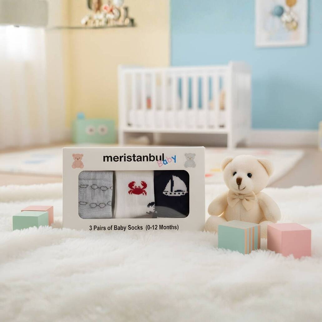 Meristanbul Bebek Çorap Seti 3–6 Ay 3’lü Yengeç, Yelken ve Gözlük, bebeğinizin ayaklarına gün boyu konfor sağlarken eğlenceli deniz temalı desenleriyle stilini tamamlar. Yumuşak pamuklu dokusu, cilt dostu yapısı ve sevimli tasarımlarıyla hem günlük kullanımda hem de özel anlarda güvenle tercih edilebilir. Aynı zamanda kullanışlı ve şık bir hediye alternatifi arayanlar için de mükemmel bir seçimdir.