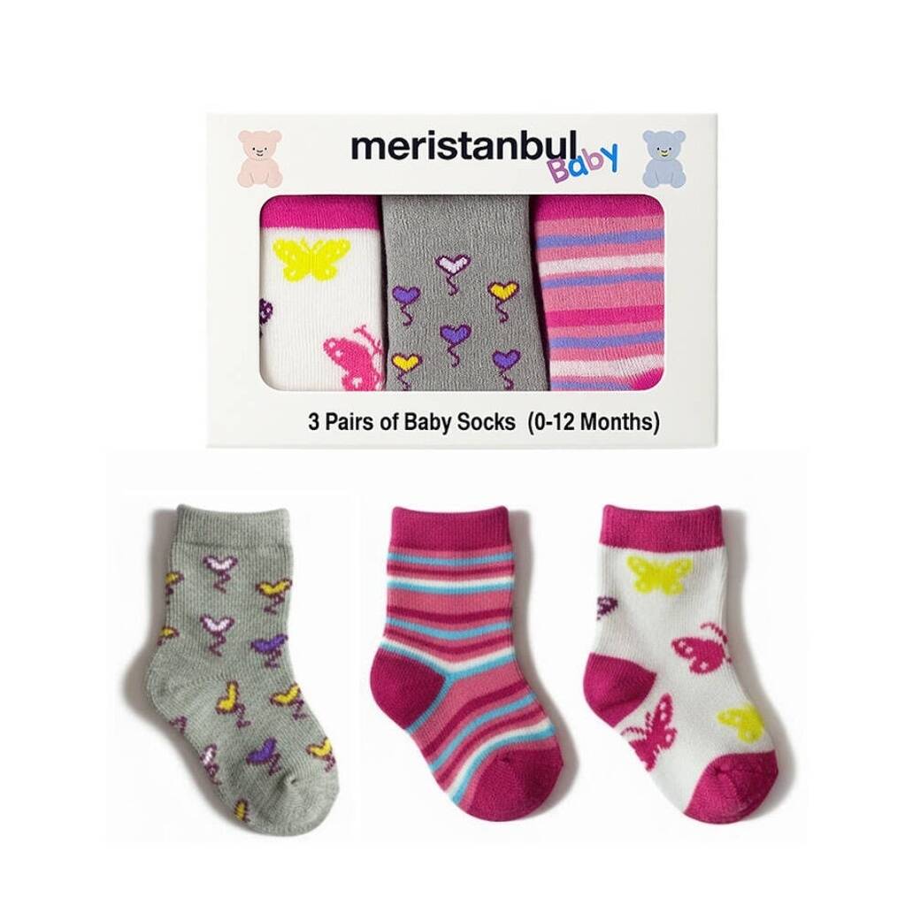 Meristanbul Bebek Çorap Seti 9–12 Ay 3’lü Kalp, Kelebek ve Çizgili, bebeğinizin ayaklarına gün boyu konfor sunarken sevimli desenleriyle stilini tamamlar. Yumuşak pamuklu dokusu, cilt dostu yapısı ve zarif tasarımlarıyla hem günlük kullanımda hem de özel anlarda gönül rahatlığıyla tercih edilebilir. Aynı zamanda anlamlı ve kullanışlı bir hediye alternatifi arayanlar için de mükemmel bir seçimdir.