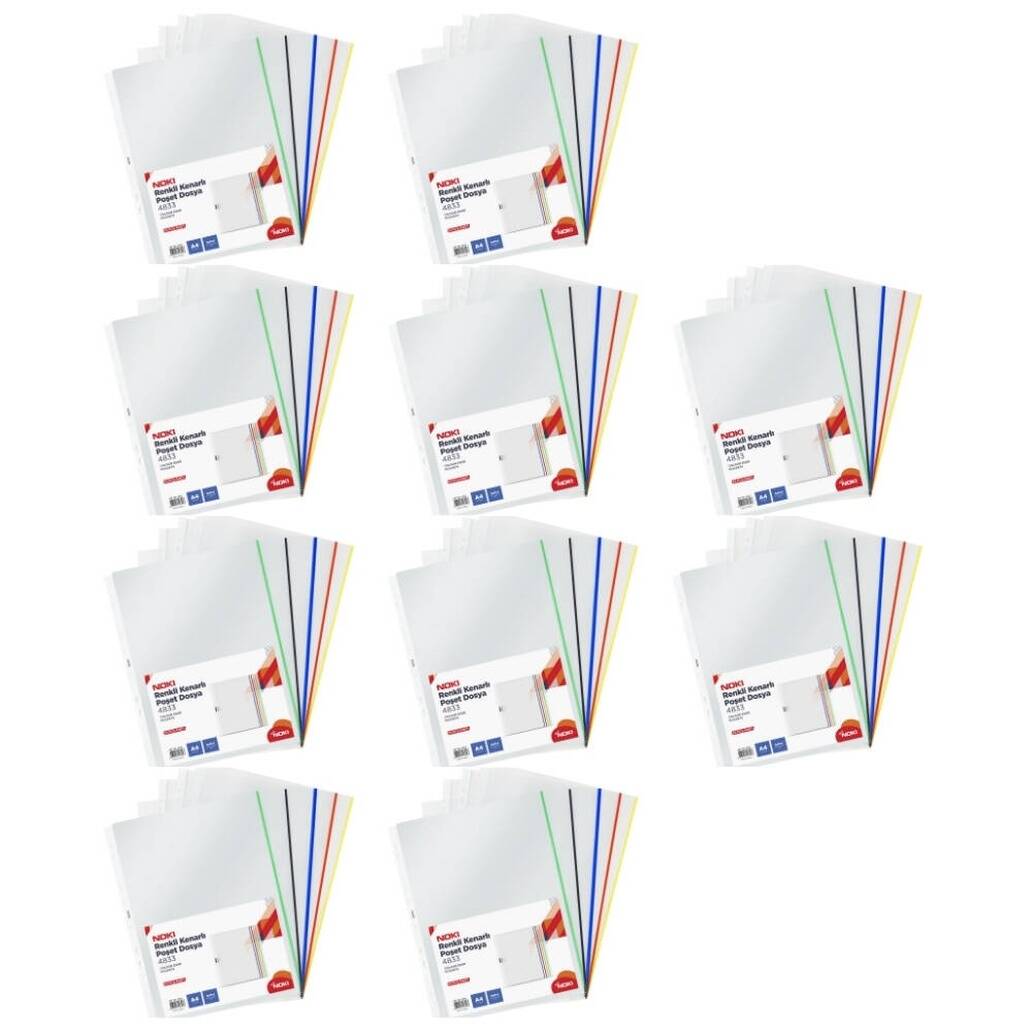 Ürün Adı: Noki A4 Poşet Dosya, 10 Adet, 5 x 5 Renkli Kenarlı, 25'li Paket