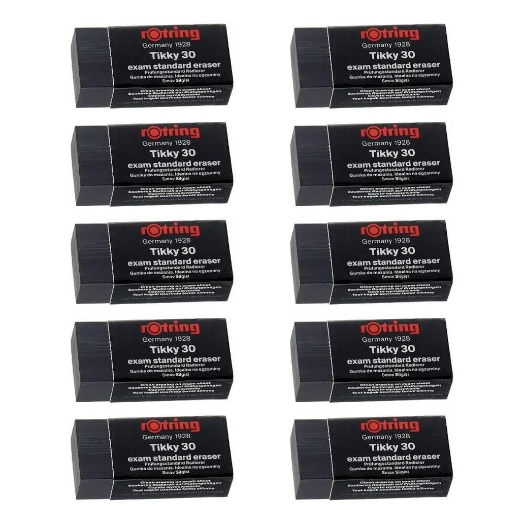 Rotring Tikky 30 Sınav Silgisi, 10 adetlik seti, siyah rengi, iz bırakmayan ve tozsuz yapısı ile hem öğrenciler hem de profesyoneller için mükemmel bir tercihtir. Temiz, düzenli ve güvenilir silme deneyimiyle her ortamda kullanabileceğiniz kaliteli bir üründür.