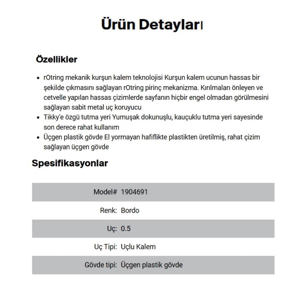 İster öğrenci, ister profesyonel bir kullanıcı, isterse hobi amaçlı yazı veya çizim yapan biri olun; Rotring Tikky 0.5 mm Bordo versatil kalem, yüksek kalite standartları ile beklentilerinizi karşılayacak niteliktedir. Not tutmaktan teknik çizimlere, tasarımdan günlük yazı deneyimlerine kadar çok yönlü bir kullanım sunar.