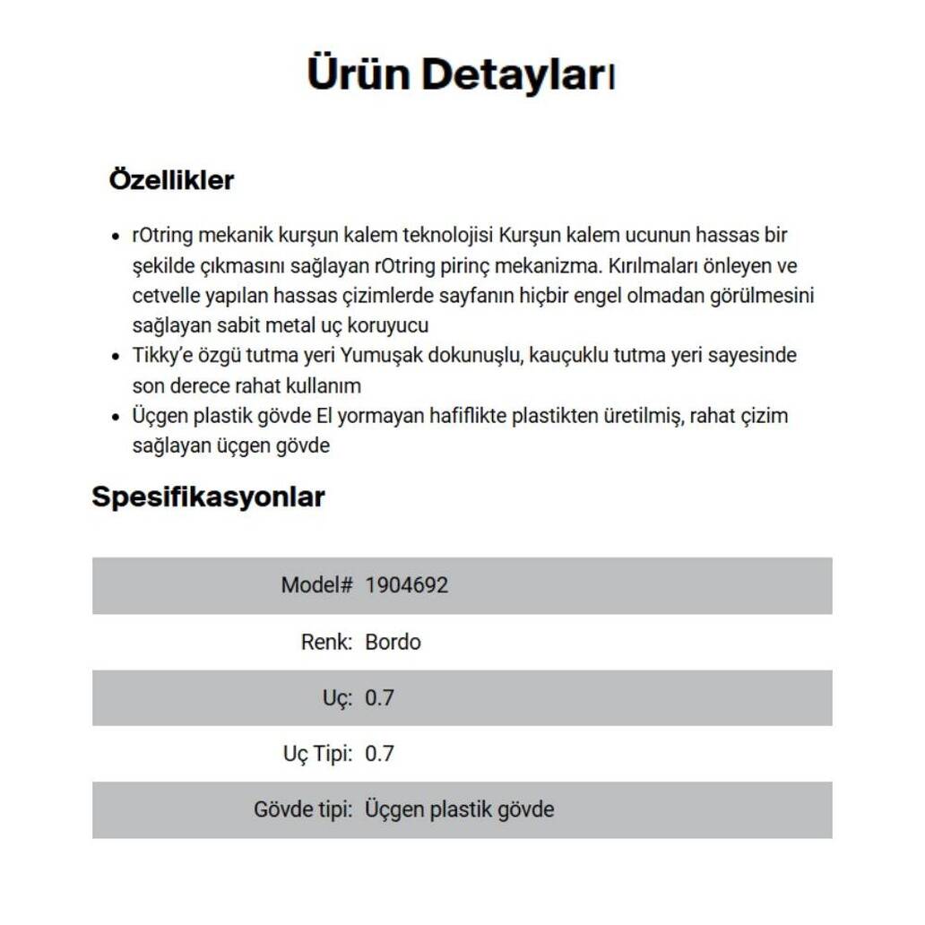 Rotring markasının köklü kalem üretim geleneği, Tikky serisinde de kendini göstermektedir. 0.7 mm uç kalınlığı ile net ve akıcı bir yazım sağlayan bu versatil kalem, dayanıklı malzemeleri sayesinde uzun ömürlü kullanım vadeder. Kauçuk tutma alanı, kalemin elden kaymasını engelleyerek stabil ve kontrollü bir yazım deneyimi sunar.