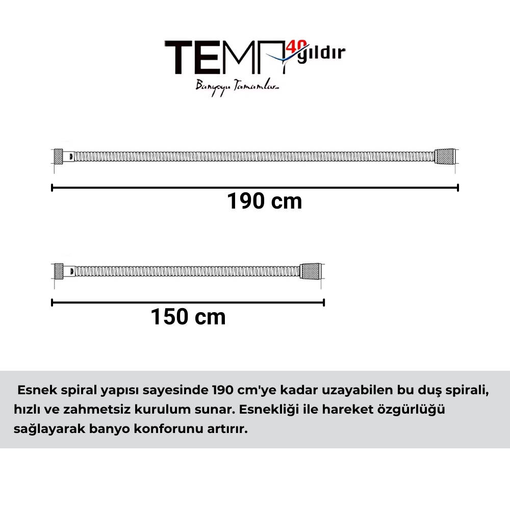 TEMA Duş Spirali, Paslanmaz – Uzayabilen Banyo Hortumu, 150 – 190 cm, geniş kullanım imkânı sunar:
