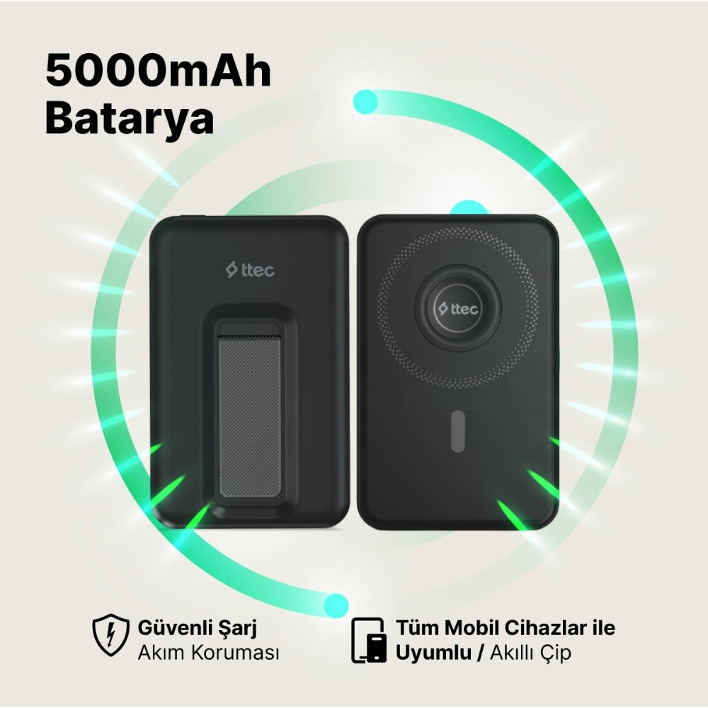 Ttec ReCharger Powerbank 5.000mAh MagSafe Uyumlu, Stantlı, Siyah modeli; kompakt boyutu, güçlü performansı ve modern tasarımıyla günlük yaşamınızı kolaylaştırmak için üretildi. Akıllı çip teknolojisi sayesinde cihazlarınızı güvenli ve verimli biçimde şarj ederken, MagSafe uyumu ile zahmetsiz kablosuz kullanım sağlar.