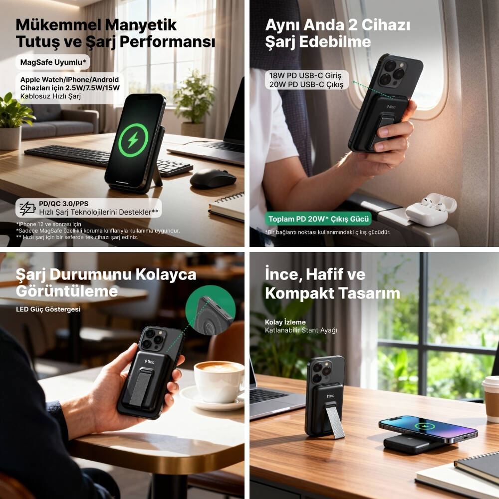 İster ofiste, ister evde, ister yolculukta olun; Ttec ReCharger Powerbank 5.000mAh MagSafe Uyumlu Stantlı Siyah, her durumda sizi bağlantıda tutan zarif ve güçlü bir enerji çözümüdür.