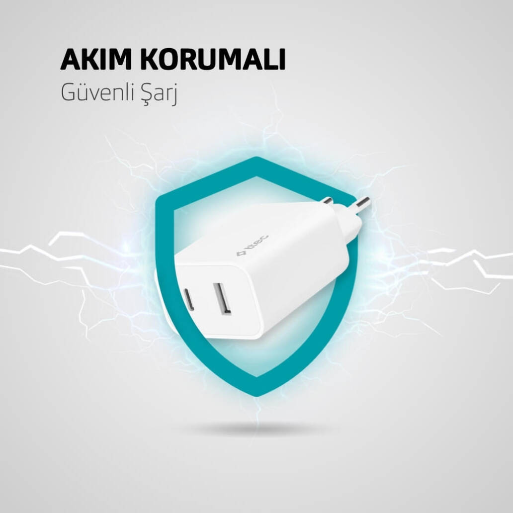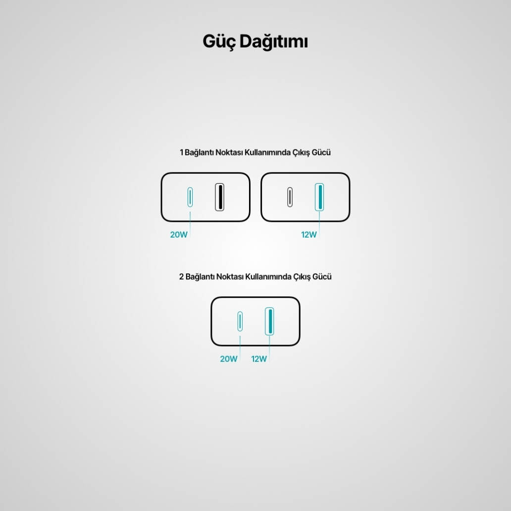 Uyumlu Tasarım: USB-C 20W ve USB-A 12W çıkışlarıyla geniş cihaz uyumluluğu sağlar.