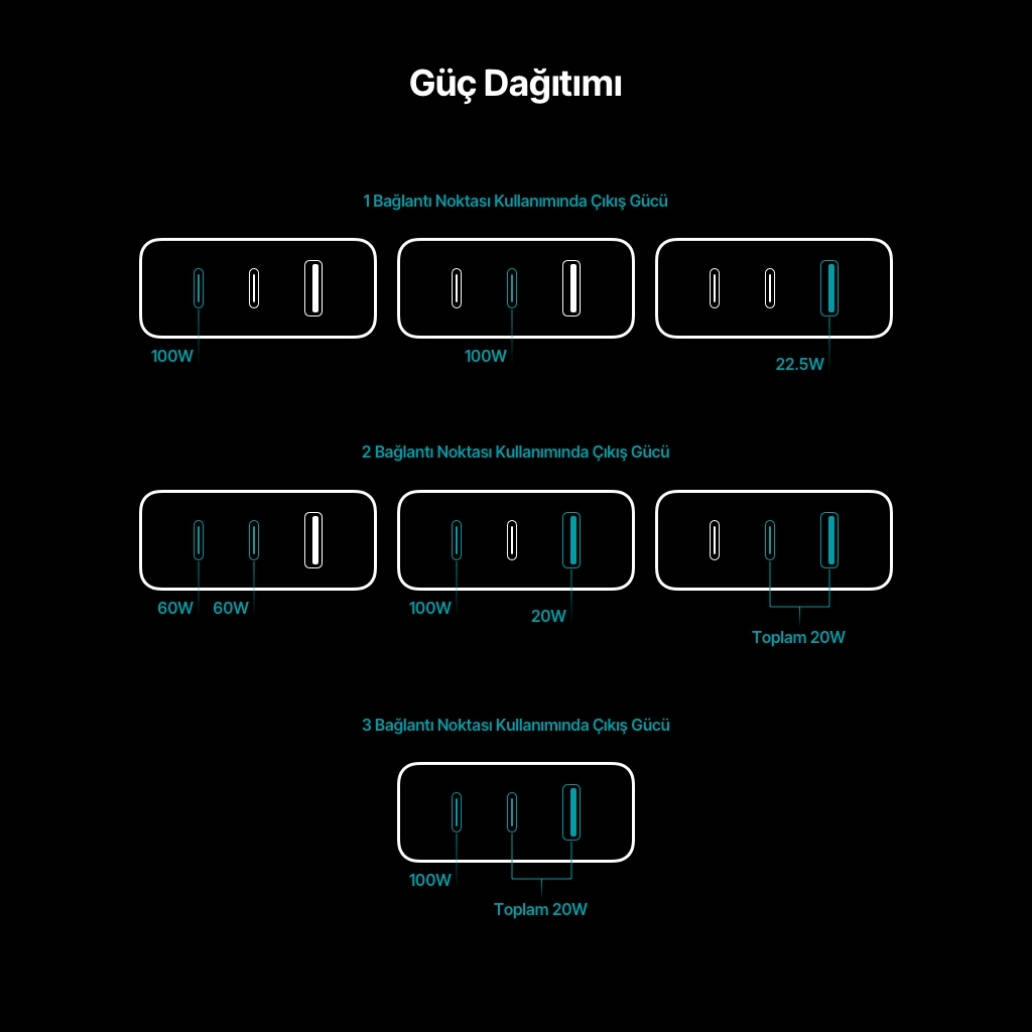 Toplam 120W güç kapasitesine sahip olan bu model, 2 adet PD 100W USB-C ve 1 adet 20W USB-A çıkışı ile geniş cihaz uyumluluğu sağlar. Akıllı çip teknolojisi sayesinde USB-C dizüstü bilgisayarlar, tabletler ve mobil cihazlar için uygun güç dağılımını otomatik olarak ayarlayarak güvenli ve dengeli şarj imkânı sunar. Aynı anda üç cihaz bağlanabilmesine olanak tanıyan yapısı, çoklu cihaz kullananlar için pratiklik sağlar.