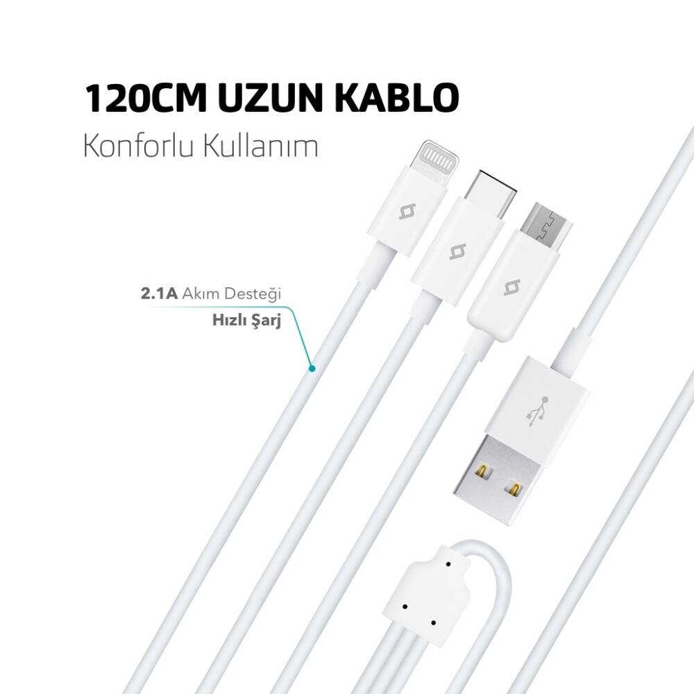 Model: Ttec Trio Şarj Kablosu USB-A - USB-C / Lightning / Micro USB, 120 cm, Beyaz